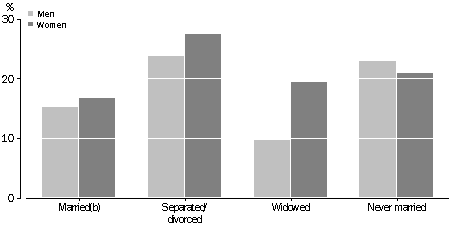Living arrangements Overall, the proportion of people with a mental disorder decreased as the number of people living in the household increased. This may reflect the difficulties that some of these people have in forming and maintaining relationships. After adjusting for age, the prevalence of mental disorder was highest for both men and women living alone. This was the case for anxiety, affective and substance use disorders individually. Age standardised rates were higher among people who were separated or divorced (24% of men and 27% of women) compared to people who were married, widowed or never married. In particular, people who were separated or divorced had higher rates of anxiety or affective disorders (18% and 12% respectively) than the other groups. People who had never married also had higher rates of mental disorder than those who were married. In particular, this group, had higher rates of substance use disorders (14%).