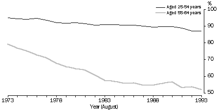 Source: Survey of Retirement and Retirement Intentions Sources of income The availability of non-labour sources of income is generally acknowledged as critical to a person's decision to retire. This is regardless of whether retirement is voluntary or forced through labour market conditions, or through ill health or injury. Men who retire aged 55-64 years are less likely than those who retire at age 65 years or over to receive government pensions or benefits as their main source of income. In 1992, among men who had retired aged 55-64 years, 46% had retirement schemes, investments or savings as their main source of income and 42% had government pensions and benefits. In comparison, among men who had retired aged 65 years or over, 28% had retirement schemes, investments or savings as their main source of income and 64% had government pensions and benefits (see Retirement income). Along with the decline in full-time labour force participation among older men over the last 20 years has been an increased take-up of service and, more recently, disability pensions. There was a large increase in the number of veterans receiving service pensions during the 1980s, peaking at over 80,000 in 1983-86. The effect of large numbers of World War II veterans reaching their early 60s was a major reason for this increase. By 1993 the number of veterans aged 60-64 years receiving a service pension had declined to just over 6,000, the lowest in 20 years. Among older men not in the full-time labour force (i.e. working part-time, looking for part-time work or not in the labour force), the take-up rate of the disability pension has increased considerably since the early 1980s, from 26% in 1983 to 39% in 1993. The patterns were slightly different for those aged 55-59 years and those aged 60-64 years. In the former group, 34% were in receipt of a disability pension in 1983, rising to 41% in 1987 and then easing to 38% by 1993. Among the latter group, 21% were in receipt of a disability pension in 1983 and this proportion rose over the next ten years to reach 40% in 1993. The increase was particularly sharp in the late 1980s when the numbers receiving a service pension were in decline. In addition, there appears to be a broad association with unemployment rates. For example, the unemployment rate of men aged 60-64 years was 7% in 1983 compared to 16% in 1993; corresponding figures for men aged 55-59 years were 7% and 12%. This is consistent with the increased likelihood of meeting the eligibility criteria for a disability pension in times of high unemployment (see Social security transfer payments). VETERANS RECEIVING SERVICE PENSIONS