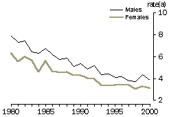 Source: ABS Causes of Death collection. Over the last decade of the 20th century, the neonatal death rate from conditions originating in the perinatal period declined by 26%, from 3.1 deaths per 1,000 live births in 1987-1990 to 2.3 deaths per 1,000 live births in 1997-2000. In 1997-2000, 56% of neonatal deaths from conditions originating in the perinatal period were due to maternal factors and complications of pregnancy, labour and delivery (36% of all neonatal deaths). Because of changes in the classification of causes of death, a comparable figure is not available for 1987-1990. The two other common types of conditions originating in the perinatal period were hypoxia, birth asphyxia and other respiratory conditions (accounting for 12% of neonatal deaths in 1997-2000), and disorders relating to length of gestation and fetal growth (accounting for 4% of deaths). Both types of conditions made up a greater proportion of neonatal deaths a decade earlier (27% and 19% respectively in 1987-1990). Over the same period, there was a slight increase in the proportion of deaths from conditions which originate in the perinatal period which were not identified. Between 1987-1990 and 1997-2000, the neonatal death rate for congenital malformations declined from 1.6 to 1.1 deaths per 1,000 live births, partly due to improved screening methods to detect such conditions (including amniocentesis and ultrasound) and greater awareness of preventative measures during pregnancy. NEONATAL MORTALITY RATE(a) (a) Rate per 1,000 live births. Source: ABS Causes of Death collection. Postneonatal mortality Between 1980 and 2000, the mortality rate for babies aged 28 days and under one year declined by 53% from 3.6 to 1.7 deaths per 1,000 live births. The rate of decline was similar for boys and girls. Babies who die after the first 28 days of life were likely to die from a greater range of causes than those who die in their first four weeks of life. Congenital malformations and conditions originating in the perinatal period were again among the more common causes of postneonatal deaths, accounting for 21% and 12% of deaths respectively in 1997-2000. However, the most commonly cited group of causes were symptoms, signs and abnormal clinical and laboratory findings not elsewhere classified. This group of causes accounted for a third of postneonatal deaths in 1997-2000, the bulk of them (30% of all postneonatal deaths) caused by Sudden Infant Death Syndrome (SIDS).
