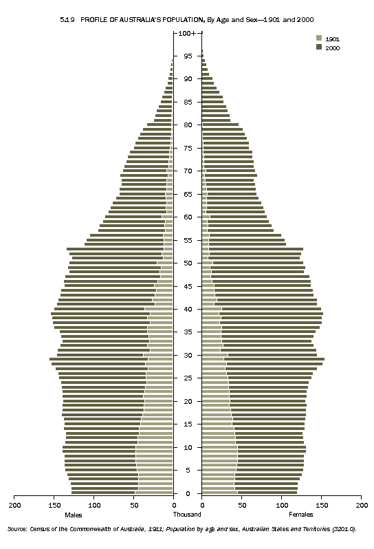 Since the first half of the 20th century, Australians have been having smaller families. This is reflected in a fall in the proportion of children (aged under 15) within the population from 35% in 1901 to around 21% in 2000. Conversely, the proportion of the population aged 65 and over has increased markedly, from 4% in 1901 to 12% in 2001. These features are shown in graph 5.20.