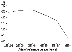 In 1999, approximately 63% of all households where the reference person was of workforce age (15-64 years) lived in a dwelling which had been renovated in the last 10 years. Households with a reference person aged 25-44 years were the most likely to live in a renovated dwelling (66%), while those with a reference person aged 65 years or over (retirement age) were the least likely to live in a renovated dwelling (43%). The higher propensity for households with a reference person of workforce age to live in a renovated dwelling in 1999 is linked with the higher incomes of households living in renovated dwellings, as household income is usually highest when its members are employed.