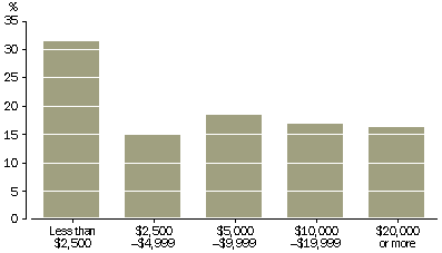 In 1999, households in the upper income quintiles spent more on their renovations than those in the lower quintiles (averages of $19,100 and $5,800 respectively). While almost a third (31%) of all households who had renovated had spent under $2,500 on these activities, one-third (33%) had spent over $10,000 on their renovations, including 16% who had spent over $20,000.