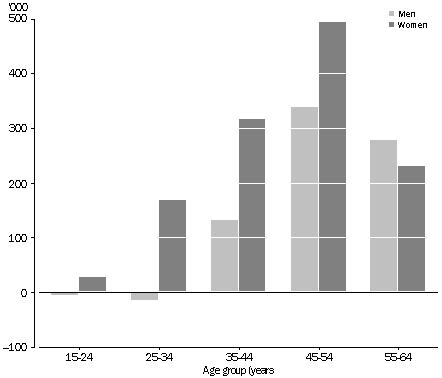 The biggest increase in the labour force is projected to occur in the 45-54 years age group. Between 1993 and 2011, this group's share of the labour force is projected to increase from 19% to 23%. In this period, the male labour force aged 45-54 is projected to rise by 0.3 million to 1.3 million and the female labour force by 0.5 million to 1.2 million.