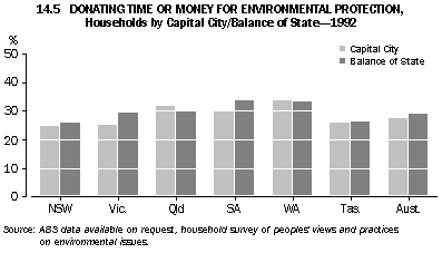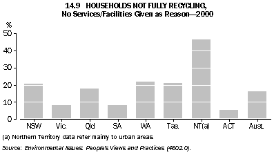Australians who did not nominate the environment as their most important social issue were asked if they were concerned about environmental problems; in 1999 some 69% indicated that they were. The proportion of people expressing concern for the environment has declined slowly since 1992 (graph 14.3). People with higher incomes and more education are more likely to express concern for the environment (ABS 1996). However, higher household incomes can also increase environmental pressures because of the link between affluence and increased consumption of resources and waste production (Yencken and Wilkinson 2000). Donating time and money to environmental protection A study of the proportion of households donating time or money to environmental protection between 1992 and 1998 found an overall decline in the proportion in every State and Territory (graph 14.4). States and Territories that showed the largest falls were the Northern Territory (by 16%), the Australian Capital Territory (13%), Queensland (12%), and Western Australia (11%). New South Wales showed the smallest fall (5%) (Alle, Aravena and Henty 2001). The study also compared households located in the capital city of each State with those in the rest of the State (the comparison could not be done for households in the ACT and NT). It found that there were no large differences, in 1992 or 1998, in the proportions of households in the two categories donating time or money (graphs 14.5 and 14.6). Household waste management Household recycling Household solid waste is defined as waste from domestic premises; it includes household refuse, garden waste and other discarded materials, such as disused furniture. An important response to household waste is recycling. Household recycling has increased in Australia during the nineties: in 1992 around 85% of people recycled some items of waste; by 2000 this had risen to about 97%. Paper, old clothing, plastic bags and glass were the items most commonly recycled (graph 14.7). Only a small proportion of Australian households (just under 7% in March 2000) recycle all the waste items that can be recycled. While recycling rates have improved, more household waste still goes to landfill than is recycled; an audit in 1997 found that the average Australian household produced 15.7 kg of waste for collection each week (Beverage Industry Environment Council 1997). This comprised 11.9 kg of garbage, 3.1 kg of recyclables, 0.2 kg of contaminants and 0.5 kg of green waste. Recycling behaviour in Australia is different for different types of households. For example, one person households recycle less than all other types of households (graph 14.8). The most common reason provided by the 93% of Australian households that did not fully recycle in 2000 was a lack of recyclable materials in their waste (around 73% of the households not fully recycling). The next most common reason cited by households was the absence of recycling services or facilities; households from the Northern Territory were the most likely to select this reason for not fully recycling (graph 14.9). Only a small proportion of households (around 3%) in Australia recycled no waste items at all in 2000; this proportion has fallen in every State and Territory since 1992 (graph 14.10). National targets for minimisation of solid waste While recycling of solid waste by households is important, waste minimisation by all sectors has been seen by policy makers as the key to reducing the environmental pressures arising from solid waste going to landfill. In 1990 the Australian and New Zealand Environment and Conservation Council set a national target of a 50% reduction in waste going to landfill by the year 2000, based on 1990 per capita levels. This target has not been met, and it is possible that the levels of waste going to landfill have not been reduced at all (the uncertainty stems from a lack of consistent national data) (Chalkley Consulting and Global Environmental Consulting 2000). Estimates of household waste produced in Australia in the early nineties were around 400 kg per person per year (OECD 1999). Total solid waste going to landfill in Australia in 1996-97, however, was around 1,100 kg per person per year (total solid waste includes waste associated with councils servicing residential areas as well as commercial, industrial, construction and demolition waste) (ABS 1998). As the construction and demolition industries are thought to generate up to 40% of all solid waste going to landfill in Australia, businesses in these industries, in partnership with government, have initiated and funded their own improvements to solid waste management (Environment Australia 2000). Assessing the performance of the household sector in waste minimisation remains problematic. Household hazardous waste Households accumulate hazardous waste, such as garden chemicals and paint products. In 2000 a smaller proportion of households (21%) took their household hazardous waste to a dump or central collection point than in 1996 (30% of households). This decline was despite an increase in households' awareness of the availability of facilities in their area for the safe disposal of household hazardous waste (37% awareness in 2000 compared to 31% in 1996).