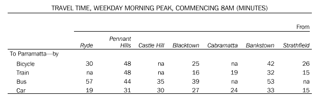 - Travel times to Parramatta-morning peak;