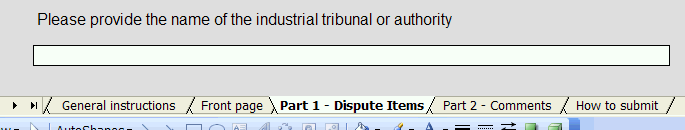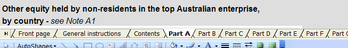 General Construction and Layout There should be an additional "E" at the end of all form IDs on the front of form to clearly indicate, in the Forms Repository view, that it is the Excel version of the paper form. If an "E" is already used in the form name, then use an "X" at the end. Layout of Excel form content is based directly on the paper form. This includes all instructions and notes except any paper-specific ones. For example, "Tick all that apply" should be replaced with "Please indicate with an 'X'..." and references to reply paid envelopes should be removed. The text of notes, definitions and instructions should align under the first letter of text, not under the dotpoint. However, this preferred formatting should only be done where practical, and where time permits. The bottom edge of response boxes should align with the text, or with the last line of text for questions with more than one line of text. In order to achieve this, you may have to use merged cells for the question text. For example: Diagram 3.1 It is possible to merge a number of cells across rows and columns in order have enough space to fit the question without the need to increase row heights. Using tall row heights for questions makes it impossible to align response boxes with the question text, so this practice should be avoided where possible. Response boxes should be correctly aligned because it makes it easier for the respondent to identify the correct place of response. Diagram 3.2 shows an example of the use of merged cells with and without formatting. The merged cells are identified by the lack of grid lines: Diagram 3.2 Forms are designed at a screen resolution of 800x600 to accommodate the lowest resolution in widespread use, and, allowing for the white space at the bottom of worksheets, so that they print off to closely resemble their paper equivalents. BSCs have the option to include comments boxes at the end of each part (worksheet) to enable the respondent to document any problems or concerns at the time they occur. This is currently a feature of the Local Government Finance (LGF) Excel form. For example: Diagram 3.3 If comment boxes are used, then the BSC's business process and IT systems may be affected, and the BSC should be made aware of this so that they can plan to identify and deal with the extra information being collected. Macros There are two types of Macros used for Excel forms, the first are form formatting macros used by the form developers to construct the form, protect it etc. These should not be stored in the form. The second type of Macro is meant for use by the respondent, and is stored within the form workbook. Note that Excel forms should not include macros unless there is a specific need that can only be achieved by using a macro. Such a macro is "Add Rows" in the IFAB Form 90 Excel workbook. These macros are developed by TA for ESG. Such macros should undergo extensive testing with providers and ABS processes (Secure Deposit Box). Note: care is required as some macros will not pass through our security systems and/or the provider's security. Macros for use by the respondent and represented by a button in the worksheet should be positioned intuitively. For example "Add Row" should be positioned at the end of the last row and column, where the respondent would already be looking when the need for additional rows arises. Buttons should not appear at the top of columns where they can be confused with column headings. Diagram 3.4 shows an example of where a button should be placed in relation to the relevant response box: Diagram 3.4 Worksheets and Sections All Excel forms are divided into worksheets of varying length that represent the sections or parts of the paper form. The main use and features of the worksheets will be described below. Excel forms may use more parts and sections than the paper form equivalents to aid navigation and for convenience in assembling the form. It can be easier to have standard parts (Please read first, How to use this form, How to submit, Time taken) separate, so that they can be inserted as a sheet into new forms. All forms should start with a standard 'How to use this form' worksheet about navigation and saving, followed by the 'Front of Form' and 'Please read this first' worksheets. For long forms, a 'Content' worksheet should be included after the 'Please read this first' sheet. This describes where to find the relevant sections, for example: Diagram 3.5 Each Part or Section has an Excel 'tab' at the bottom of the screen that can be used to navigate between worksheets. Tabs should be labelled with the part headings, not the part numbers (or letters). The exception to this rule is for a survey with a large number of worksheets, such as the Survey of International Investment (SII), where it is not practical to use the full part heading for every worksheet tab. The following example shows how the tabs should be labelled: Diagram 3.6 This example shows how tabs are labelled when there are a large number of worksheets: Diagram 3.7 If there are simply too many sheets to avoid some of them scrolling out of view horizontally, an additional instruction should be included in the 'How to use ..' section: Diagram 3.8 Inside a given section/part/worksheet the content is displayed in one scrolling 'page', though in some cases this results in only a portion of the screen being used. Subsequently, references to paper form page numbers are removed and inter-page gaps and spacing adjusted to give an even, continuous, display. Each worksheet ends with a note to the effect that it is the end of that worksheet. 'End of part' notifications should be placed in the bottom right hand corner of the 'page'. The natural navigation of the eye will make this area of the worksheet the last part viewed by the respondent. By putting the 'End of part' notification there, respondent eye movement is reduced. The 'End of part' notifications should also be meaningful by describing w