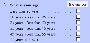 Ruled lines When drawing your form keep the amount of ink on the form to the minimum necessary for the form to work properly. Every extra bit of ink on the form is looked at and evaluated by the respondent. If it is not necessary and has to be (mentally) discarded, it contributes only to the respondent load and to the subsequent detriment of the data quality. The basic principle you should always follow is to use as few lines as is absolutely necessary. The lines you use should be no thicker than is needed to do the job and should be consistent throughout the form. You can use lines for several purposes on forms. These are shown below. The thickness of the lines varies depending on whether a coloured or a black and white form is used. Line thickness can be specified in InDesign. Dividing columns A line used for dividing columns should be used for all split page layouts. The line should begin at the top of the first line of type (or the top of any boxes) and end at the bottom of the last line of type (or the base of any boxes) (see Diagram 4.1). Diagram 4.1 Dividing sections For a full page layout, the ends of a line used for dividing sections should be both left and right aligned with the widest spaced objects on a page (see Diagram 4.2). For a split page layout, the section dividers and column dividers should join neatly, but ensure they don't form a cross (section dividers in both columns meeting), otherwise respondents may incorrectly read across the page rather than down. Section dividers should only be used when necessary for easy navigation of a form, and when used they should be consistent throughout the form. Diagram 4.2 Defining boxes containing instructions Boxes containing instructions should have a 2 point white line around them for coloured forms, and a 0.5 black line for black and white forms (see Diagram 4.3). Diagram 4.3 Defining answer box boundaries The 0.5 point line is used for normal answer boxes on both coloured and black and white forms (see Diagram 4.4). This line is in solid drop-out colour for OCR forms and black for other forms. Boundaries for "Total" answer boxes should be 1 point so they stand out more. Diagram 4.4 Guide lines for writing in answer boxes The 0.5 point regular dotted line is used for guide lines on both coloured and black and white forms (see Diagram 4.5). Diagram 4.4 Eye-guides between text and answer spaces The 0.5 point irregular dotted line (usually three dots then a space) is used for eye-guide lines on both coloured and black and white forms to link the text with the answer box (see Diagram 4.6). Diagram 4.6 Width of instruction boxes In setting out boxes of instructions the principle to be applied is that a form should use as few different alignments as possible and that similar elements are shown consistently throughout the form.'Note' boxes, where two columns of text are used, should extend to the full useable width of the page where possible. Instruction boxes, including 'Including/Excluding' boxes, and 'Note', 'Definition' and 'Examples' boxes can go the full width of the page or slightly less to incorporate an answer box to the right. When different kinds of instructions are used in the one form, they should all be the same width. When only an Including or an Excluding is contained in a box rather than both, the box should still be the same width as if there were both. The information should be presented in the same way as usual next to a space, so that all includings in the form are aligned with each other and all excludings are also aligned (see Diagram 4.7). Diagram 4.7 Answer spaces All answer spaces should be white and bounded by a continuous solid line of the appropriate thickness, see above. Diagram 4.8 Allow 4 mm width per character in answer spaces (see Diagram 4.9). Sufficient width should be allowed for the number of characters expected in the majority of cases, rather than the largest possible answer. Diagram 4.9 Allow 8 mm height for answer spaces and 8 mm for each line in answer boxes where there is more than one line (see Diagram 4.10). Note that the line forming the base of the answer box is used as an answer space. Diagram 4.10 Dollar thousands ($ ,000's) Where financial items are used, answers should generally be stated in thousands of dollars. Most ABS forms use dollar thousands so this is preferred for consistency, especially when many businesses receive several ABS forms and they can have an impact on the quality of each other. In general, amounts rounded to the nearest whole dollar are more accurate than is actually needed, and is therefore unnecessary respondent burden. Rounding to dollars should only be used when very small values are expected from a significant number of respondents and it is important to know how many respondents are involved in that particular economic activity, regardless of the size of their contribution. Where space allows, the answer boxes should contain the following captions: