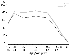 Labour force participation Projections of male labour force participation rates differ markedly across age groups. For men aged 15-19, the participation rate is projected to fall from 55% in 1993 to 52% in 2011. For men aged 45-54, the participation rate is projected to fall slightly from 89% in 1993 to 88% in 2011. The most significant projected decrease is for men in the 55-59 years age group, a fall from 72% in 1993 to 66% in 2011. These projections have been based on the prevailing trends of 1978-93, a period when the labour force was expanding and early retirement became increasingly common (see Australian Social Trends 1994, Early retirement among men). If new factors enter the picture, such as raising, or dispensing with, compulsory retirement ages, labour force participation rates in older age groups may not drop so significantly. In contrast, female labour force participation rates are projected to increase for all age groups except those aged 15-19. In the past, female labour force participation rates have shown an M-shaped pattern with the peaks occurring in the 20-24 and 35-44 years age groups. The trough in the 25-34 years age group largely reflects prime child-rearing ages. Increasingly, women are continuing to participate in the labour force after having children and this trend is expected to continue. The labour force participation rate for women aged 25-34 is projected to increase from 66% in 1993 to 79% in 2011 and the rate for women aged 35-44 from 70% to 84% over the same period. The combination of these projected changes in labour force participation and the projected changes in the size and structure of the population (see Projections of the working age population) results in a projected labour force in 2011 quite different in structure from the labour force of 1993. Overall, male labour force participation is projected to decrease from 74% in 1993 to 69% in 2011 while female labour force participation is projected to increase from 52% to 57%. By 2011 the number of men in the labour force is projected to be 5.8 million compared to 5.0 million in 1993. This represents an average annual growth rate of 0.8% over the period. In comparison, the number of women is projected to increase from 3.6 million in 1993 to 4.9 million in 2011, an average annual growth rate of 1.7%. In 1993, women made up 42% of the labour force; by 2011 the proportion is projected to increase to 46%. LABOUR FORCE PARTICIPATION RATES, 1993 AND 2011 Men Women Source: Labour Force Projections Age structure Both the male and female components of the labour force are projected to age in the next 18 years. In 1993 the median age of the labour force was 36.0 years (36.6 years for men and 35.1 years for women). By 2011 the median age is projected to have increased to 39.0 years (39.4 years for men and 38.5 years for women). In 1993 there were 1.87 million people aged 15-24 in the labour force. By 2011 this is projected to have increased slightly to 1.89 million. The number of men aged 15-24 in the labour force is projected to decrease by 7,300 while the number of women is projected to increase by 26,500. People aged 15-24 will be a declining proportion of the total labour force. In 1993, those aged 15-24 represented 22% of the labour force but this is projected to have fallen to 18% by 2011. In contrast, people in older age groups are projected to contribute a larger share of the labour force. In 1993 there were 641,900 people aged 55-64 in the labour force. This is projected to grow by 507,500 to 1.15 million by 2011, increasing the overall representation of the 55-64 years age group from 7% to 11%. The biggest increase in the labour force is projected to occur in the 45-54 years age group. Between 1993 and 2011, this group's share of the labour force is projected to increase from 19% to 23%. In this period, the male labour force aged 45-54 is projected to rise by 0.3 million to 1.3 million and the female labour force by 0.5 million to 1.2 million. PROJECTED GAINS IN THE LABOUR FORCE, 1993-2011 Source: Labour Force Projections