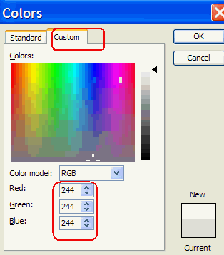 • colours can be set by going to <Tools> then <Options> and clicking on the "Color" tab. You need to select one of the colours in the palette and then select "Modify", as shown in Diagram 2.1. Choose the "Custom" tab and type in "222" or "244" to all three components of the colour model, as shown in Diagram 2.2.