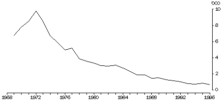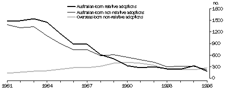 Trends in adoption Australia-wide statistics on the number of adoptions have been available since the year ended 30 June 1969. The number of adoptions in Australia peaked in 1971-72, when 9,798 adoptions were recorded. Four years later this number had halved (4,990 in 1975-76), by 1979-80 it had dropped to one third (3,337) and by 1995-96 there were only 668 adoptions recorded in Australia. Since overseas adoptions made up only a small proportion of all adoptions until the mid 1980s, the decline since the 1970s can be attributed to the fall in the number of Australian-born children available for adoption. The major turnaround in the number of adoptions after 1972 occurred at a time of rapidly changing social attitudes surrounding the plight of young unmarried mothers. The introduction of the Supporting Mothers' Benefit in July 1973 meant that single parenting for young unmarried mothers became a realistic option, thus reducing the pressure to relinquish their child for adoption. The turnaround also occurred at a time when attitudes and laws relating to the termination of unwanted pregnancies were changing. The conditions under which a pregnancy could be terminated were relaxed in Victoria in 1969 and New South Wales in 1972 (the two most populous States in Australia). General practitioners, in line with changing community attitudes, had started prescribing the contraceptive pill (previously restricted to married women) to young unmarried women. This, together with the emergence of family planning centres (see Australian Social Trends 1998, Family planning) and sex education classes, had a big impact on the ability of young women to avoid unwanted pregnancies. In addition, the number of women in the workforce has increased over the last two decades, as has access to child care facilities. This has further improved women's economic independence and their ability to support a family on their own.2 As a result of these changes, the supply of new-born babies available for adoption dropped sharply. In 1979-80, when information about the ages of adoptees was first available, adopted children aged under one year represented 81% of all adoptions of Australian-born children by non-relatives. By 1995-96 this had dropped to 33%. The more recent development of alternative reproductive technologies, such as in-vitro fertilisation (IVF) and gamete intrafallopian transfer (GIFT) have avoided the need for adoption for some couples unable to conceive a child naturally, although the number of such cases is small. In 1994 in Australia there were 2,715 births following IVF or GIFT treatment.3 RELATIVE AND NON-RELATIVE ADOPTIONS, 1980-81 TO 1995-96 Year ending 30 June Source: AIHW, Adoptions Australia, 1995-96, 1997; AIHW, Adoptions Australia, 1994-95, 1996; AIHW, Adoptions Australia, 1993-94, 1995. Changes in legislation Recent changes in legislation are likely to affect the number of adoptions in the future. First, the introduction of the Family Law Reform Act (1996) and changes to individual State and Territory laws have restricted adoption by relatives, particularly those by step parents. Step parents adopt children to legally integrate the child into a new family structure by changing the child's name and giving full legal rights and obligations to the step parent.4 The restrictions now allow non-custodial parents to retain rights of guardianship, access or custody.5 Adoptions by relatives other than step parents are also now discouraged as they can distort biological relationships. For example, if a child is adopted by a sibling, the birth mother would then become the child's grandmother. Most States and Territories have policies in place which promote the use of guardianship or custody orders, rather than adoptions, to place children in the care of non-parental relatives.5 Second, alternative legal orders have been introduced that transfer guardianship and custody of a child to another person without changing the child's legal status. For instance, in 1995-96 in Victoria, 110 permanent care orders were granted, compared to 74 adoptions of Australian-born children. As a result, adoptions by relatives have dropped more sharply than those by non-relatives. The number of Australian-born children adopted by relatives had already been declining at a faster rate than those adopted by non-relatives since 1980-81. In most years since 1988-89 there have been more children adopted by non-relatives than by relatives. AUSTRALIAN-BORN CHILDREN ADOPTED BY NON-RELATIVES, BY AGE