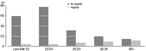 Source: AIHW, Adoptions Australia 1995-96 and 1979-80 (cat. no. 4406.0). Australian-born adoptees in 1995–96 During 1995-96 there were 394 adoptions of Australian-born children. Of these, 217 adoptions were by non-relatives and 177 were by relatives, mostly step parents (167). Australian-born children who were adopted by non-relatives were generally younger than those who were adopted by relatives. Two thirds (66%) of Australian-born children adopted by non-relatives in 1995-96 were under five years of age, compared to 8% of children adopted by relatives. Most Australian-born children adopted by relatives were aged between 5 and 14 years (72%), while only 29% of children adopted by non-relatives were in this age range. In 1994-95, nuptiality details were known for 298 of the 311 Australian-born children adopted by non-relatives. Of these, the majority (82%) were born ex-nuptially. Adopted ex-nuptial children were more likely (68%) to have younger birth mothers (aged under 25 years) than those born nuptially (23%). Conversely, 31% of adopted children born nuptially were born to mothers aged 35 and over. While for every age group of birth mothers, the number of adopted children born ex-nuptially exceeded the number born nuptially, the difference declined as the age of the mother increased.