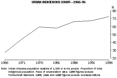 Over the last 30 years the Indigenous population has become increasingly urbanised. In 1966, 27% of Indigenous people in the census lived in urban areas; 30 years later this had been completely reversed with only 27% of Indigenous people living outside urban areas. In contrast, the proportion of the total population living in urban areas varied between 83% and 86% in the same period. Increases in the count of Indigenous people outside urban areas have been quite close to what could be expected of a demographically normal population.