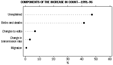 Combining the effects of births, deaths, census editing and migration, just under half of the increase in the count between 1991 and 1996 can be explained. There are variations by states and territories in the proportion explained; these are discussed in detail in the paper.