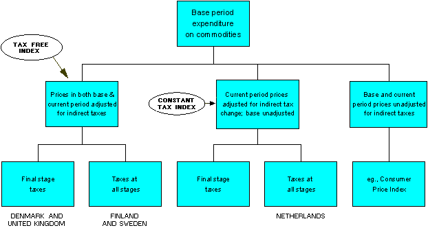 6.21. As a result, there are four alternative methods for calculating net price indexes which are shown in diagram 7. It is necessary to decide not only whether a constant tax or a tax free index is preferred, but also whether adjustments should be made for only the first round effects of a taxation change or for all effects.