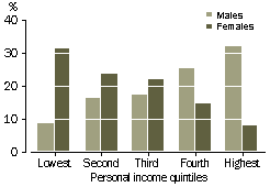 Income distribution The distribution of personal incomes between women and men also changed over the 1980s and 1990s. One commonly used measure of the distribution of income between the sexes is the proportion of women and men in each income quintile. If there were no inequality in women’s and men’s incomes, then we would expect that each quintile group would contain equal proportions of each sex. In both 1982 and 1999-2000, women were more heavily concentrated in the lower quintiles of the personal income distribution, and men more concentrated in the higher quintiles. In 1982, 31% of all women were in the bottom quintile. In 1999-2000, the proportion of women in the lowest quintile had decreased to 26%. Consequently, more women moved into the higher income quintiles. In 1982, 8% of all women were in the highest income quintile, compared with 11% in 1999-2000. For men, the proportion in the lowest quintile increased from 9% in 1982 to 15% in 1999-2000. These changes inevitably meant that the proportion of men in the highest income quintiles decreased over the period, from 32% in 1982 to 29% in 1999-2000. One of the main reasons women’s share of total personal incomes increased, and more women had incomes near the top of the personal income distribution in 1999-2000 than in 1982, was that over this period, the proportion of women with earnings from employment increased. Women’s increased participation in the labour force during the 1980s and 1990s was underpinned by developments such as legislation recognising equality in employment, changes in family formation and child bearing patterns, improved availability of publicly subsidised child care services, and an increase in the availability of part-time and casual employment. At the same time, many industries traditionally employing men declined, and men’s overall labour force participation also declined.