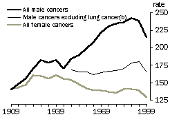 In 1909, the age-standardised death rate for cancer was similar for males and females (140 and 141 per 100,000). The rates for each sex began to diverge in the 1950s, and by 1985 the age-standardised male death rate from cancer was 248 compared with the female death rate of 146 per 100,000.