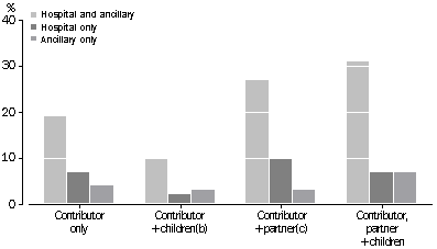 The type of private health insurance varied according to the type of contributor unit. Having both hospital and ancillary cover was most common for those people in couple contributor units with dependent children (31%) and couple units without children (27%). Hospital only insurance was also most commonly reported in couple contributor units with no dependants (10%) and ancillary cover only was most often reported among people in contributor, partner and dependent children units (7%).