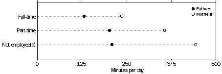Types of child care activities Parents provide care for their children in various ways, often just passively minding them while they are attending to other activities such as cooking or cleaning - or just relaxing. However, they also spend time actively looking after the personal needs of their children, such as feeding, cuddling, reading or talking to their children, as well as some time on extra tasks such as organising their daily activities. The extent to which mothers and fathers share their time in attending to various child care activities can be demonstrated by focusing on parents with similar work commitments - for example, where both parents are employed full-time. In general, in families where both parents worked full-time, mothers spent about twice as much time as fathers on child care (nearly 4hrs for mothers and 2hrs: 4 mins for fathers). Moreover, mothers spent more time than fathers on all types of child care activities, for children of all age groups. Children under school age commonly require much more personal attention than older children. Consequently, both mothers and fathers (where both were working full-time) spent more time with children aged 0-4 years. For fathers, this time was fairly evenly divided between active and passive child care activities (1hr: 27 mins and 1hr: 33 mins, respectively), while mothers spent more time on active child care (3hrs: 15 mins, compared with 2hrs: 47mins on passive child care), particularly on the physical and emotional care of these children (1hr: 50mins per day, on average). Mothers spent more time than fathers on the physical and emotional care of older children, too, but for both partners this declined sharply with the age of the child. Time spent playing, reading and talking with their children declined less sharply with the age of the child, and became the dominant type of active care for both parents of older children, particularly fathers. After children reach school age, parents spent more time on passive than active child care - almost as much for 5-9 year olds (1hr: 30mins for fathers and 2hrs: 12mins for mothers) as for 0-4 year olds (1hr: 33mins and 2hrs: 47mins, respectively). Much less time was spent on the passive care of children in the 10-14 years age group (22mins and 33mins, respectively). Other child care activities, such as getting children's things ready for the next day, visiting child care establishments and associated travel, took up much less time - less than 25 minutes per day for both parents, for children of any age. FATHERS AND MOTHERS: AVERAGE REPORTED TIME SPENT PER DAY ON CHILD CARE ACTIVITIES IN FAMILIES WHERE BOTH PARENTS WORKED FULL-TIME, 1997