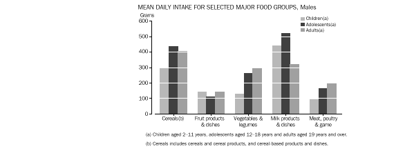 TYPES OF FOODS EATEN The Dietary guidelines for Australians (NHMRC 1992) and the Dietary guidelines for children and adolescents (NHRMC 1995b) recommend that Australians eat a wide variety of nutritious foods. Over 90% of Australians in almost every age group reported consuming something from cereals and cereal products the day before interview, with slightly less consuming milk and milk products. More than 65% of people of all ages ate cereal-based products and dishes; vegetables; meat and poultry; and fats and oils. At least 50% of people of most ages reported eating fruit products and dishes. (Table 3.) The types of foods eaten varied by age and sex. For example: