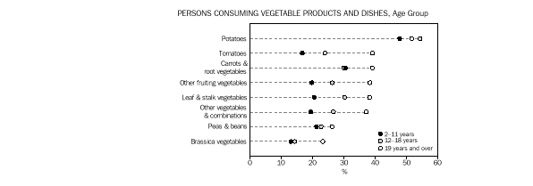 Vegetable products and dishes Vegetables are low in fat and rich in dietary fibre and essential nutrients such as pro vitamin A, vitamin C, folate and vitamin E . The Dietary guidelines for Australians (NHMRC 1992) and the Dietary guidelines for children and adolescents (NHMRC 1995b) also encourage Australians to eat plenty of vegetables. More than 70% of the Australian population had eaten vegetables the day before interview. A greater proportion of adults consumed vegetable products and dishes than children. Potatoes were the most commonly consumed vegetable, with approximately 45-60% of the Australian population reporting that they had eaten potatoes. At least one-third of Australian adults reported eating carrots; leaf and stalk vegetables; tomatoes; other fruiting vegetables (e.g. pumpkin); or other vegetables and vegetable combinations. (Table 3.) The mean daily intake of vegetables generally increased with age and was highest for persons aged 45-64 years. Potatoes were the main contributor to the mean intake of vegetable products and dishes, due to the high proportion of consumers with a high median intake. Other important contributors were tomatoes, carrots, other fruiting vegetables, and other vegetables and vegetable combinations. The median intake of cabbage, cauliflower and similar brassica vegetables by those who consumed was one of the highest median intakes after potatoes. (Tables 1, 2 and 3.)