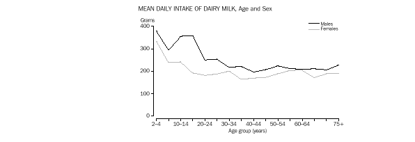Milk products and dishes Milk is an excellent source of many nutrients but in particular of calcium, riboflavin and protein. The vast majority of Australians consumed milk products and dishes. The proportion consuming declined from 98% of children aged 2-3 years to 90% of adults aged 19-24 years and increased to 95% of persons aged 65 years and over. The lowest proportion was recorded for females aged 16-18 years (87%). (Table 3.) Australians were more likely to have consumed dairy milk than any other milk product. A smaller proportion of females aged 16-18 years consumed dairy milk than any other age group of either sex (63%). Dairy milk accounted for approximately 70% of the mean daily intake of milk products and dishes for persons of all ages. (Tables 1 and 3.) However approximately 45% of both males and females aged 16-18 years had eaten cheese, a higher proportion than any other age group. A higher proportion of children and adolescents had consumed frozen milk products than adults with the average intake being highest for 12-15 year olds. (Tables 1 and 3.) Some differences in adult consumption of milk products and dishes were: