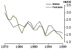 Trends in drug-related deaths In 1999, there were 1,737 deaths where the underlying cause was identified as drug-related, representing 1.4% of all deaths in that year. The number of drug-related deaths in 1999 was almost two and a half times the number in 1979 (734). Over the 1979-1999 period, the standardised drug-related death rate increased by 79%, from 5 to 9 deaths per 100,000 population. The overall increase in drug-related deaths over this 20 year period was driven primarily by increases in drug-related deaths of males. In 1979, males and females had similar standardised drug-related death rates (around five deaths per 100,000 population). By 1999, the rate for males had grown to almost 14 deaths per 100,000 while the rate for females was still around 5 per 100,000. Consequently, males accounted for 72% of drug-related deaths in 1999 compared with 48% in 1979. DRUG-RELATED DEATH RATES(a) (a) Standardised rate per 100,000 persons. Source: ABS Causes of Death collection. Accidental drug-related deaths Drug-related deaths are usually the result of an unintentional overdose or the effects of prolonged misuse of drugs. The rates of accidental deaths due to drugs increased more rapidly between 1979 and 1999 than those for all drug-related deaths, a fourfold increase from 2 to 8 deaths per 100,000 population. Of the total drug-related deaths in 1999, 81% were accidental, 16% were suicides and 3% were of undetermined intention. In contrast, accidental drug-related deaths comprised just 35% of all drug-related deaths in 1979. The accidental drug-related death rate for males increased sixfold over the period to 11 deaths per 100,000 population, with 80% of this increase occurring since 1989. In comparison, the death rate for females increased from 2 to 4 deaths per 100,000 between 1979 and 1999. Consequently, despite having similar death rates in 1979, by 1999 the rate for males was almost three times that for females. Increases in the use and availability of heroin (an opiate) have been a focus of public debate over the 1990s. Opiates were the cause of 31% of accidental drug-related deaths in 1979. By 1999, this had increased to 63%. ACCIDENTAL DRUG-RELATED DEATH RATES(a) (a) Standardised rate per 100,000 persons. Source: ABS Causes of Death collection. Suicide by drugs In contrast to accidental drug-related deaths, suicides by drugs decreased over the 1979-1999 period. Furthermore, the death rates from suicides by drugs were more equally distributed between males and females. Rates for both males and females declined from 3 per 100,000 in 1979 to around half that in 1999. The suicide rate for non-drug-related methods for males increased from 15 to 20 deaths per 100,000 population over the 1979-1999 period, while the corresponding rate for females increased from 3 to 4 deaths per 100,000 population. Consequently, the proportion of all suicides from drugs has halved; from 16% to 8% of male suicides, and from 49% to 24% of female suicides. RATES OF SUICIDE BY DRUGS(a) (a) Standardised rate per 100,000 persons. Source: ABS Causes of Death collection. Demographic characteristics The tendency of people to die from drug-related causes varies across the population, according to people’s ages, marital status and place of residence. In addition, the demographic characteristics of people who died accidentally from drug-related causes differed substantially from those who suicided using drugs. In 1999, rates of accidental drug-related deaths were highest among young adults, peaking among 25-29 year olds at 20 deaths per 100,000 population, gradually falling with age before stabilising at around 2 deaths per 100,000 for people aged 55 years and over. Over the last two decades there has been a steady increase in the age at which people die from accidental drug-related causes, due to the large increase in the death rate from this cause of men aged in their 30s and 40s. This may reflect the ageing of the population of illicit drug users over the period. Accidental drug-related death rates were highest for people who had never married (25 deaths per 100,000) and for those who were divorced (16 per 100,000 population). In contrast, the death rate for people who were married was 2 deaths per 100,000 in 1999. The comparatively low rate for married people suggests they may be less likely to use drugs, especially more lethal drugs such as heroin. DRUG-RELATED DEATHS, SELECTED CHARACTERISTICS, 1999