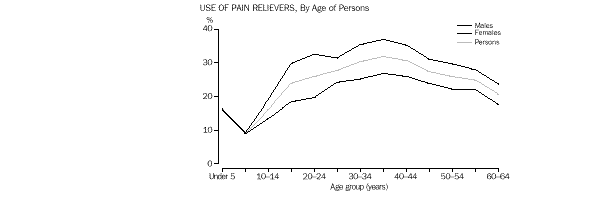 The proportion of both males and females using pain relievers was highest in the 25-44 year age group (table 1). Differences between male and female usage varied considerably across age groups. For children under 10 years, the proportion of boys and girls using pain relievers was similar. The difference widened to 13 percentage points for those aged 20-24 years as a result of the rapid increase in the use of pain relievers by young females.