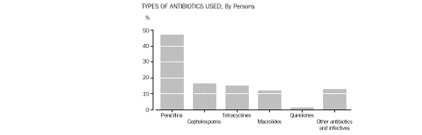 Most people (93%) who had recently used an antibiotic had used only one type (table 19). The most commonly used were penicillins (47%).