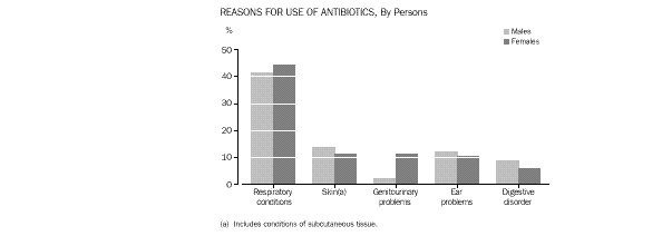 To enable analysis of antibiotics and other medications in this group, a sub-sample of one-quarter of the NHS records was recoded to a more detailed classification for analysis and presentation in this publication. The following discussion on use of antibiotics is based on analysis of 515 records of persons who had recently used antibiotics (see paragraphs 17 and 18 of Explanatory Notes).