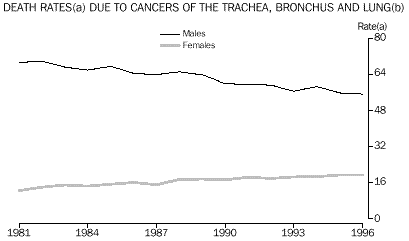 DEATHS DUE TO MALIGNANT NEOPLASMS (CANCERS) OF THE TRACHEA, BRONCHUS AND LUNG In addition to deaths due to respiratory conditions, there were 6,826 deaths due to malignant neoplasms (cancers) of the trachea, bronchus and lung, accounting for 5% of all deaths in 1996. Between 1981 and 1996, the male standardised death rate from this cause was consistently higher than the corresponding female rate. However, whilst the male standardised death rate declined by 20% (from 69.2 per 100,000 population in 1981 to 55.2 in 1996) the female rate increased by 55% (from 12.5 to 19.4).