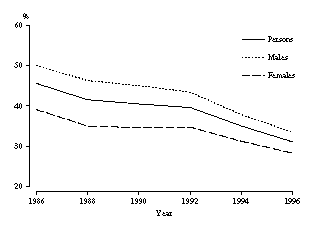 The largest decrease for any two-year period was recorded between 1992 and 1994 (five percentage points), with the 1986-88 and 1994-96 periods recording decreases of four percentage points. The smallest decrease recorded was for 1990-92 at one percentage point.