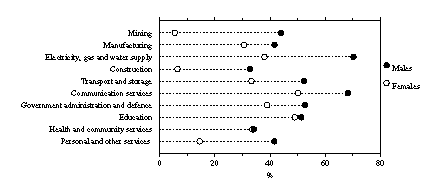 In August 1996, the highest rates of trade union membership were recorded in the Electricity, gas and water supply industry (70% of male employees and 38% of female employees) and the Communication services industry (68% of male employees and 50% of female employees).