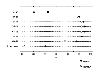 In August 1996, employees aged 55-59 years had the highest rate of trade union membership (39%). The highest rate for part-time employees was recorded for employees aged 35-44 years (26%), whilst for full-time employees the highest rate was recorded for employees aged 55-59 years (45%).