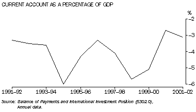 Australia's balance of payments records transactions between Australia and the rest of the world. The current account deficit during 2001-02 was $22b, or 3.1% of GDP. This deficit is mostly due to an excess of $2b in imports of goods and services over exports and net income payable to non-residents of $20b. During the last 10 years the current account deficit as a percentage of GDP fluctuated, with a high of 6.0% in 1994-95 and a low of 2.7% in 2000-01. Both exports and imports became increasingly more important to the Australian economy during this period. When expressed as a percentage of GDP, exports rose from 17% in 1991-92 to 21% in 2001-02, while over the same period imports rose from 17% to 22%. Australia's terms of trade - which reflects changes in the prices of exports relative to those for imports - improved by 2.6% in 2001-02 which is the third consecutive year of improvement.