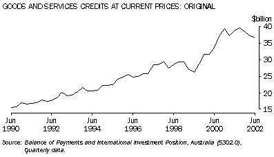 Explanatory Notes Goods and services credits (exports) are real resources that are provided to foreign residents. In the balance of payments they appear as credit items. Goods credits refers to all movable goods which change ownership from residents to non-residents. These transactions are valued in f.o.b. (free on board) terms which means that transportation and insurance costs beyond Australia are excluded. In ABS balance of payments publications, goods credits are categorised into general merchandise and other goods. General merchandise is classified into rural and non-rural goods, with each of these classifications further broken down so that the trading performance of different commodity groups can be monitored. Other goods includes goods for processing and repair, goods procured in ports by carriers (mainly fuel) and non-monetary gold. Services credits are transactions in services provided by Australian residents to non-residents. These are categorised into groups such as transportation, travel, communication, construction, insurance, financial, computer and information, royalties and licence fees, other business, personal, cultural and recreational, and government services not elsewhere included. More detailed breakdowns are provided under many of these categories. The export of goods and services provides domestic producers with a wider market and allows the economy, as a whole, to share in the gains from trade. Export levels are affected not only by supply constraints but also by the demand for Australian products and services in the world market. Export demand is influenced by the prices charged and also the exchange rate of the Australian dollar. If the Australian dollar depreciates (falls in value), Australian exports will generally become cheaper for foreign residents and consequently they may demand more Australian goods and services. Export demand is also influenced by the level of economic activity in countries that purchase Australian exports.