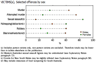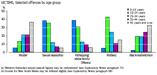 VICTIM CHARACTERISTICS Sex and Age In 2011, more males than females were victims of murder (64%), robbery (60%), and blackmail/extortion (59%). More females than males were victims of sexual assault (85%) and kidnapping/abduction (60%). More than two in five robbery victims in 2011 were aged between 15 and 24 years (43% or 4,848 victims) (Table 2.2).