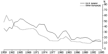 (b) Includes other countries of birth. Source: Overseas Arrivals and Departures (unpublished data). Overseas-born Australians In 1995, 58% of overseas-born Australians had been born in a European country, over half of these in the United Kingdom or Ireland. However the proportion born in the United Kingdom and Ireland dropped from 79% in 1901 to 29% in 1995. In 1901 the other important European country of birth was Germany (4%). By 1947 the proportion had dropped to 2%. It increased to 5% again during the 1950s and 1960s before dropping to 3% by 1995. Italy provided a substantial proportion of the overseas-born population, particularly in the second half of the century. In 1966, 13% of overseas-born Australians had been born in Italy. However by 1995, this had halved to 6% of the overseas-born population. SELECTED COUNTRIES OF BIRTH OF OVERSEAS-BORN AUSTRALIAN RESIDENTS