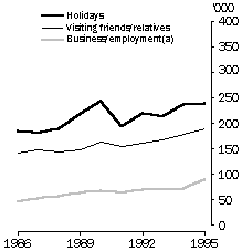 (b) Includes other reasons. Source: Overseas Arrivals and Departures (unpublished data). PROPORTION OF SHORT-TERM OVERSEAS VISITS TO AND FROM AUSTRALIA Source: Overseas Arrivals and Departures (unpublished data). Australians visiting Europe As for the number of European visitors to Australia, the number of Australians visiting Europe has also increased. Between 1986 and 1995 visitor numbers grew by 37%, from 397,000 to 544,000. In comparison, 939,000 Australians visited Asia in 1995, up from 497,000 in 1986. As a proportion of all departures, trips to Europe declined from 26% to 22%. In 1995 most Australians visiting Europe did so for a holiday (44%) or to visit family or friends (35%). 16% travelled for business or employment purposes. This pattern was similar in 1986 but the increase in the number of Australians visiting Europe for a holiday has not been as high as the increase in the number of Europeans visiting Australia for a holiday. Australians going to Europe for business or employment reasons increased from 46,900 in 1986 to 89,400 in 1995. The number of Europeans coming to Australia for short-term business trips also increased over the period, from 53,800 to 85,900. The main destination of Australian visitors to Europe was the United Kingdom and Ireland. 52% of all Australians visiting Europe went to these countries in 1995. A further 9% went to Italy and 6% went to Greece and Germany. Around half of the visitors to the United Kingdom and Ireland, Greece, Italy and France were for holidays. In comparison, one quarter of visitors to Germany were for holidays, 33% were for business or employment purposes and 36% were to visit friends and relatives. REASONS FOR SHORT-TERM VISITS TO AUSTRALIA BY EUROPEANS (a) Includes visits for conferences and conventions. Source: Overseas Arrivals and Departures (unpublished data). REASONS FOR SHORT-TERM VISITS TO EUROPE BY AUSTRALIANS (a) Includes visits for conferences and conventions. Source: Overseas Arrivals and Departures (unpublished data). Investment with Europe The changes in Australia's relationship with Europe can be measured not only in the number of people moving between Australia and Europe, but also in the levels of trade and investment between Australia and Europe. At 30 June 1995, Australia had $141.2 billion invested overseas, 36% of that in Europe. At the same time, European investment in Australia made up 30% of total overseas investment in Australia. The respective proportions were much the same in 1990. Thus in terms of investment our overall relationship with Europe has changed very little in the last five years. In 1995, the United Kingdom accounted for 19% of investment in Australia and 20% of Australian investment overseas. The only country in which Australian investment overseas was greater (and whose investment in Australia was also greater) was the United States of America. The European country with the highest investment in Australia other than the United Kingdom, was the Netherlands. In 1995, 3% of investment in Australia was from the Netherlands. AUSTRALIA'S INVESTMENT POSITION AT 30 JUNE 1995