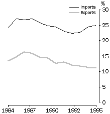 Trade with Europe Overall, the proportion of Australia's trade with Europe throughout the last decade has declined slightly. In relative terms, our exports to the European Union have dropped from a peak of 16% of total exports in 1986-87 to 11% in 1995-96. Our imports from the European Union have also dropped from 27% of total imports in 1985-86 to a low of 22% in 1992-93 before rising again to 25% in 1995-96. The balance of trade between Australia and the European Union has grown more in favour of the European Union as the gap between imports and exports has increased. The United Kingdom continues to be an important trading partner, receiving 4% of our exports, while 6% of our imports came from there in 1995-96. A further 6% of our imports came from Germany. While the balance of trade remains in favour of the United Kingdom, the gap between imports and exports has narrowed over the decade. TRADE WITH THE EUROPEAN UNION Source: International Merchandise Trade, Australia (cat. no. 5422.0). TRADE WITH THE UNITED KINGDOM Source: International Merchandise Trade, Australia (cat. no. 5422.0). Endnotes 1 Department of Foreign Affairs and Trade (DFAT) 1996, Australia's Trade with the European Union 1995, DFAT, Canberra. 2 Jupp, J. (ed.) 1988, The Australian People, for the Australian Bicentennial Authority, Angus and Robertson. 3 Eurostat 1989, Europe in Figures, 2nd edition, Eurostat, Brussels–Luxembourg. 4 British nationals were not necessarily born in the United Kingdom and Ireland. Some may have been born in Commonwealth countries (other than Australia), such as New Zealand. Prior to 1959 nationality, not country of birth, was recorded for immigrants to Australia.