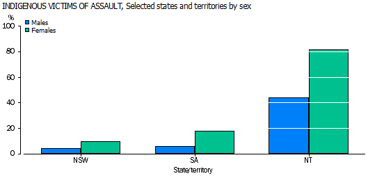 ABORIGINAL AND TORRES STRAIT ISLANDER VICTIMS In 2011, 6.8% (4,864) of victims of assault in New South Wales identified as being of Aboriginal or Torres Strait Islander origin. Aboriginal and Torres Strait Islander persons accounted for 4.4% (1,728) of male assault victims and 9.9% (3,133) of female assault victims. In 2011, 12% (1,887) of victims of assault in South Australia identified as being of Aboriginal or Torres Strait Islander origin. Aboriginal and Torres Strait Islander persons accounted for 6.2% (535) of male assault victims and 18% (1,352) of female assault victims. In 2011, 68% (4,546) of victims of assault in the Northern Territory identified as being of Aboriginal or Torres Strait Islander origin, with 44% (1,017) of male assault victims identified as being of Aboriginal or Torres Strait Islander origin and 82% (3,529) of female assault victims. Male victims who identified as being of Aboriginal and Torres Strait Islander origin experienced incidents of assault: