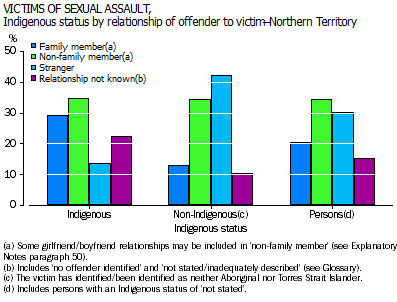 NORTHERN TERRITORY In 2011, there were 11 victims of homicide in the Northern Territory of whom 54% were male and 46% female. Victims of homicide had known the offender in 60% of cases. There were 298 victims of sexual assault of whom 278 (93%) were female. The profile of relationship of offender to victim was different for male and female victims: 16% of male victims of sexual assault were victimised by a family member and 21% by a stranger, whereas 21% of female victims of sexual assault were victimised by a family member (including 6.5% who were the victim of a partner) and 31% were victimised by a stranger. Among non-Indigenous victims of sexual assault, 13% were victimised by a family member, compared with 29% of Aboriginal and Torres Strait Islander victims. In 2011, Aboriginal and Torres Strait Islanders in the Northern Territory were almost twice as likely as non-Indigenous persons to be victims of sexual assault. The victimisation rate for Aboriginal and Torres Strait Islander victims of sexual assault was 180 victims per 100,000, compared to 101 victims per 100,000 for non-Indigenous persons. By contrast, non-Indigenous Northern Territorians were victims of robbery at almost five times the rate of Aboriginal and Torres Strait Islanders (49 victims per 100,000 non-Indigenous persons compared to 9.9 victims per 100,000 Aboriginal and Torres Strait Islanders). There were 94 person victims of robbery in the Northern Territory of whom 72% were male. Almost 70% of robbery victims reported that the offender was a stranger.