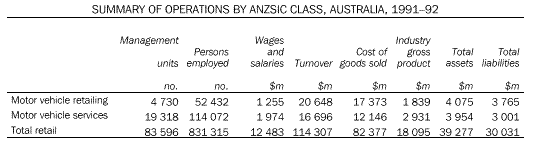 Retail Activity Survey For commodity data: In relation to transport, data are available for motor vehicle retailing and motor vehicle services. Geographic Coverage Australia, States and Territories Frequency of Data Availability Data release is irregular-approximately every six years. The 1991-92 survey data were released in 1994. The data for 1998-99 survey are expected to be released in June 2000. Historical Data The survey was first conducted in 1991-92. Products and Services Publications Retail Industry, Australia (cat. no. 8622.0) Retail Industry, Commodity Sales, Australia (cat. no. 8624.0) Retail Industry, State and Territory Summary (cat. no. 8625.0) Other Special data services are available on request. Example of Information Available