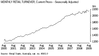- The August 2009 increase in turnover was driven primarily by Food retailing (up 2.9%) and Department stores (up 3.4%). All other major retail trade groups had small decreases in monthly turnover, with Clothing, footwear and personal accessory retail outlets experiencing the largest decrease (down 4.9%).