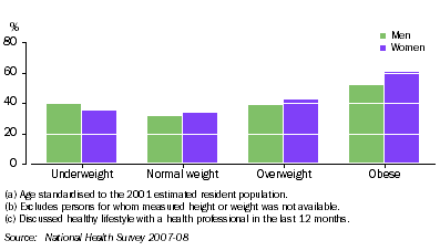 Obese men and women were more likely to discuss healthy lifestyle issues with a health professional in the last 12 months than people in the normal weight and overweight ranges. Obese women were also more likely to discuss healthy lifestyle issues with a health professional than underweight women (Graph 7.2).
