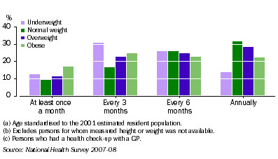 Of the adults who had a health check-up, proportionally more obese adults saw a GP at least once a month (17%) than normal weight and overweight adults (9% and 11% respectively) (Graph 7.1).