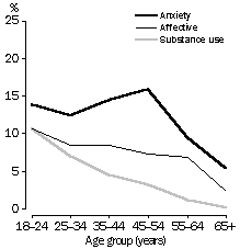 The prevalence of anxiety disorders for women aged 18-44 ranged between 12% to 15%. Women aged 45-54 had the highest rate of anxiety disorders, 16%, which steadily declined in older age groups to 5% for those aged over 64. For men, the prevalence of anxiety disorders varied little with age until age 55, after which it declined. The prevalence of affective disorders was highest at 11% for women aged 18-24, more than three times the rate for men of this age. For women, the prevalence of affective disorders generally declined with age, while for men, rates increased in the middle years before declining after age 55.