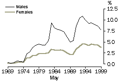 For example, the increase in the proportion of workforce-age men receiving income support payments is primarily associated with the decline in rates of full-time employment (seeAustralian Social Trends 2001, Trends in employment population ratios). Between 1969 and 1999, the proportion of workforce-age men who were unemployed or working part-time, and receiving unemployment payments, increased from less than 1% to 8%, accounting for almost half of the overall increase (from 4% to 19%) in workforce-age men receiving income support. In addition, the proportion of workforce-age men who were unable to work, and were receiving disability or sickness payments, increased from 2% to 6%, accounting for more than a quarter of the overall increase between 1969 and 1999. PROPORTION OF WORKFORCE-AGE POPULATION RECEIVING INCOME SUPPORT PAYMENTS