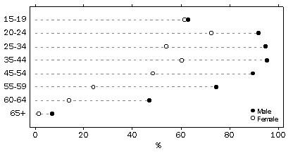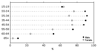 In June 2002, 64.9% of people aged 15 or over were either employed or actively looking for work. This increase on the participation rate of 60.4% in June 1985 resulted from an increasing participation rate by women.