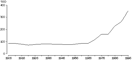 Source: Unpublished data, 1996 Census of Population and Housing; Experimental Estimates of the Aboriginal and Torres Strait Islander Population (cat. no. 3230.0). Size and distribution At 30 June 1996, there were an estimated 386,000 Indigenous people in Australia (2.1% of the total population). More than two thirds lived in New South Wales (28%), Queensland (27%) and Western Australia (15%). Indigenous people comprised only a small proportion of the population in each of the States and Territories (3.2% or less), except the Northern Territory. There, the 51,900 Indigenous people represented more than one quarter (29%) of the total population. According to 1996 Census counts, Indigenous people were generally less likely to live in major urban areas than the total population (30% compared to 63%) and more likely to live in more remote non-urban communities. However, their likelihood of living in major urban areas varied between States. This partly reflects the different settlement patterns of the total population in each State. INDIGENOUS COUNTS(a) (a) Includes augmented estimates for the years 1911 to 1966. Torres Strait Islanders were considered to be non-Aboriginal for the 1947, 1954 and 1961 Censuses. Asterisk denotes census years. Source: Smith, L. R., 1980, The Aboriginal Population of Australia; Unpublished data, 1981–1996 Censuses of Population and Housing. Population growth The 1996 Census count of Indigenous people was substantially (55%) higher than the number counted in the 1986 Census. This growth compares with an increase of 12% in the number of non-Indigenous people in Australia. The large population increase over the last decade has been part of a longer trend that started after the 1967 Constitutional Referendum repealed the requirement that Aboriginal 'natives' (persons with more than 50% Aboriginal 'blood') be excluded from population counts. The number of Indigenous people counted in the censuses between 1911 and 1966, augmented by estimates of traditional Aboriginal people who had been excluded, ranged between 80,000 and 100,000. Since the 1967 Constitutional Referendum the Indigenous population has more than trebled in size, while the non-Indigenous population counts grew by not quite half (47%). Components of growth Ongoing difficulties in measuring the main components of population change (births and deaths) among Indigenous people do not allow accurate statements to be made about the actual contribution of natural increase (ie births minus deaths) to the observed levels of growth. However, calculations obtained in the process of producing experimental estimates of the Indigenous population show that natural increase (allowing for children born to non-Indigenous women with Indigenous male partners) has accounted for about one third of the 33% growth observed between the 1991 and 1996 censuses.2 The other major source of growth comes from changes in the willingness of people to record their Indigenous status on the census form.3 The most likely group in the community to change their identification is the large and increasing number of people with mixed origins (i.e. Indigenous and non-Indigenous ancestry). It is possible that many of these people would have identified themselves as non-Indigenous (or perhaps not answered the census question) when policies of assimilation prevailed. However, with increasing action to enhance the status and rights of Indigenous people in the community, it is likely that their desire to identify with the Indigenous community has increased. Legislative and administrative changes reflecting improvements to Indigenous status and rights over the last few decades have included the enactment of the Racial Discrimination Act of 1975, the establishment of the Aboriginal and Torres Strait Islander Commission (ATSIC) in 1989 and in 1991 the Council for Aboriginal Reconciliation.4 They have also included changes in census collection strategies. These have included census awareness campaigns directed specifically at Indigenous people, together with the involvement of Indigenous people and organisations in census collection activities.5