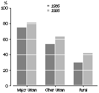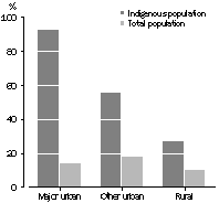 Identification within Indigenous families It is not possible from recent censuses to identify the number of Indigenous people with mixed origins or to provide direct evidence of the extent to which there have been changes in willingness to report Indigenous origin. However, some insights into both of these issues can be obtained by looking at families involving mixed marriages (those in which one partner identifies as being Indigenous) and how children in those families are identified by their parents. In 1996, close to two thirds (62%) of Indigenous families comprising a couple with children (aged under 15) had only one parent who was Indigenous, an increase from 51% in the 1986 Census. As might be expected the proportion where only one parent was Indigenous was higher in major urban areas (81%) than in other urban areas (63%) and rural areas (42%) where traditional communities are more likely to predominate. In 1996, the majority of mixed couple families (86%) had one or more children identified as Indigenous in the census. Ten years earlier, the likelihood that children in these families were identified as being Indigenous was lower (75%). Thus, in addition to the growing number of families of mixed origins, there is an increased likelihood of a child of mixed origin being identified as Indigenous. The higher representation of mixed origin families in major urban areas helps to account for the greater increase in numbers of people identified as Indigenous in those areas. Between 1986 and 1996, increases in the counts of Indigenous people were greatest in major urban areas (93%). Increases were less marked in other urban areas (56%) and in rural areas (27%). In all areas, increases were much larger for counts of the Indigenous population than the total population. The influence of inter-regional migration on the high levels of urban growth appears not to have been so important, with most Indigenous people moving within the same local area (see Australian Social Trends 1994, Aboriginal and Torres Strait Islander people). Endnotes 1 Australian Bureau of Statistics, 1997, Population Distribution, Indigenous Australians, cat. no. 4705.0, ABS, Canberra. 2 Australian Bureau of Statistics, 1998, Experimental Estimates of the Aboriginal and Torres Strait Islander Population, 30 June 1991 - 30 June 1996, cat. no. 3230.0, ABS, Canberra. 3 Taylor, John, 1997, 'The contemporary demography of Indigenous Australians', Journal of the Australian Population Association, Vol. 14, No. 1, ANU, Canberra. 4 Council for Aboriginal Reconciliation, January 1993, Making Things Right: Reconciliation after the High Court's decision on Native Title, Council for Aboriginal Reconciliation, Canberra. 5 Australian Bureau of Statistics, 1997, 1996 Census of Population and Housing: Nature and Content of the Census, cat. no. 2008.0, ABS, Canberra.